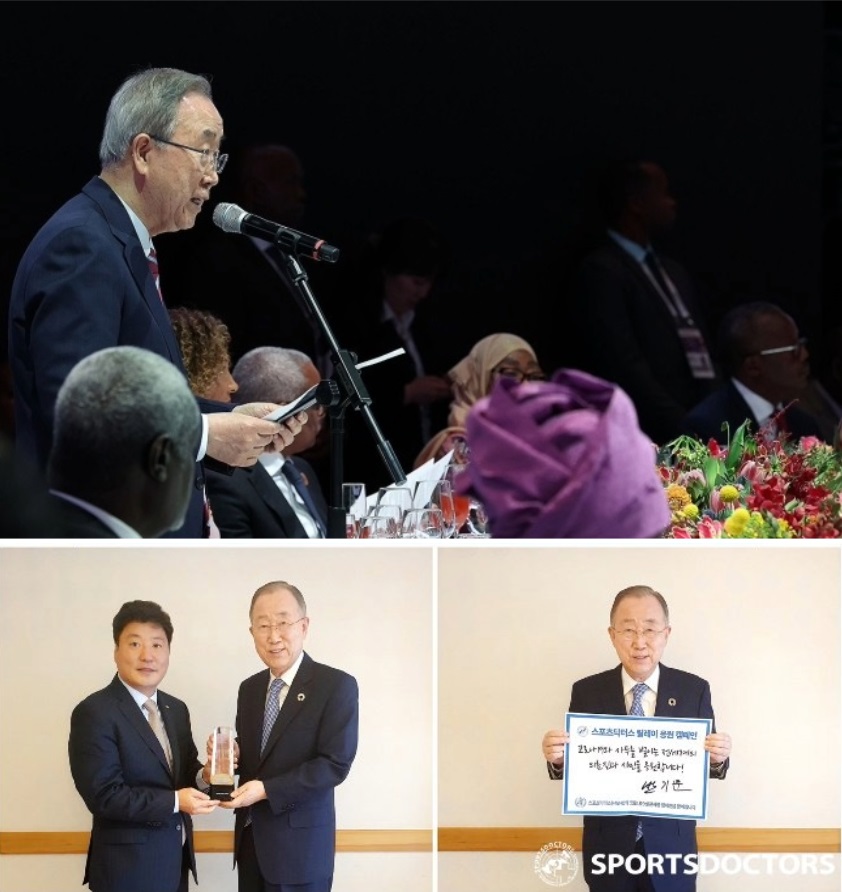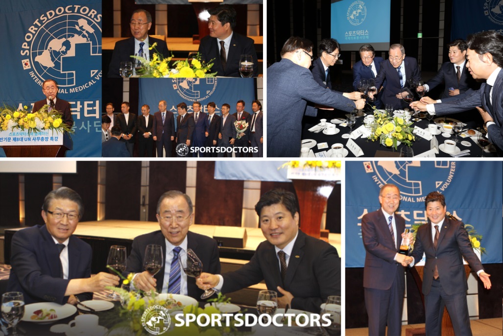반기문 전 UN 사무총장은 ‘스포츠닥터스 코로나19 릴레이 응원 캠페인’에 참여하였고, 유엔 재임기간 지구촌 의료지원에 앞장서오다 퇴임 후 2018년 첫 NGO 특별강연을 스포츠닥터스에서 펼쳐서 본인이 직접 목격한 지구촌 곳곳의 열악한 의료 환경과 그 도움의 필요성을 전세계에 전파했다. 특별강연에서 스포츠닥터스는 반기문 전 UN 사무총장의 공로를 인정하여 감사패를 전달하였다.